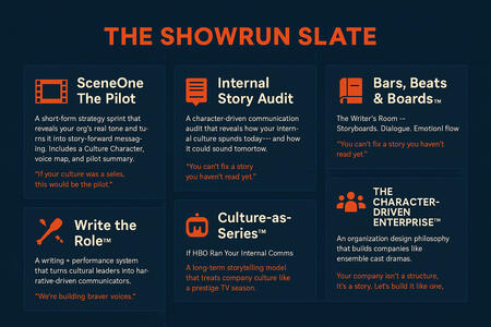 Showrun™ is a founder-led storytelling studio that transforms internal communications using TV-style narrative systems, cultural archetypes, and voice-driven